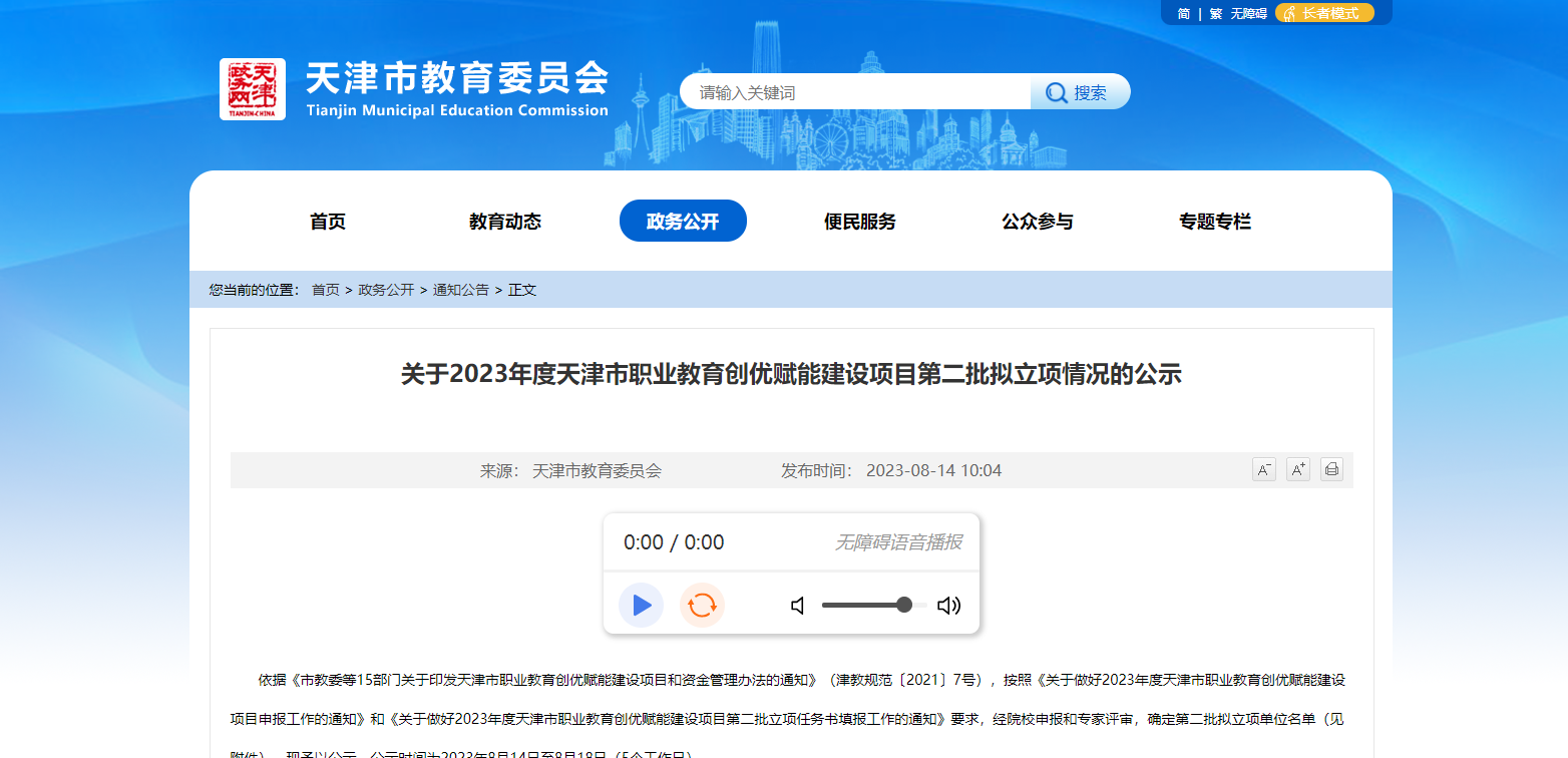 天津市教育委員會發(fā)布《關于2023年度天津市職業(yè)教育創(chuàng)優(yōu)賦能建設項目第二批擬立項情況的公示》