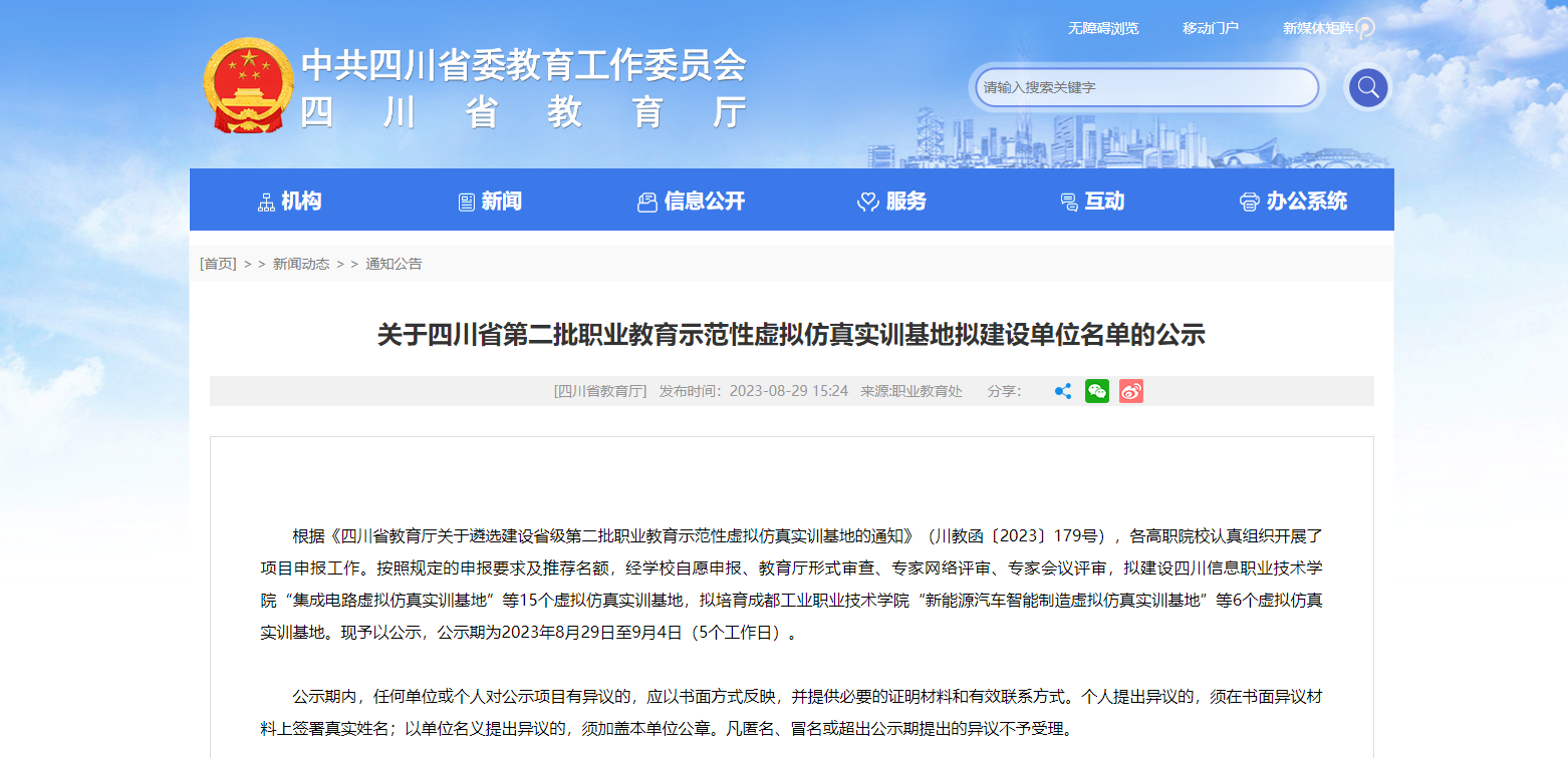 近日,四川省教育廳根據(jù)《四川省教育廳關于遴選建設省級第二批職業(yè)教育示范性虛擬仿真實訓基地的通知》(川教函〔2023〕179號),公布了第二批職業(yè)教育示范性虛擬仿真實訓基地擬建設單位名單,擬建設四川信息......