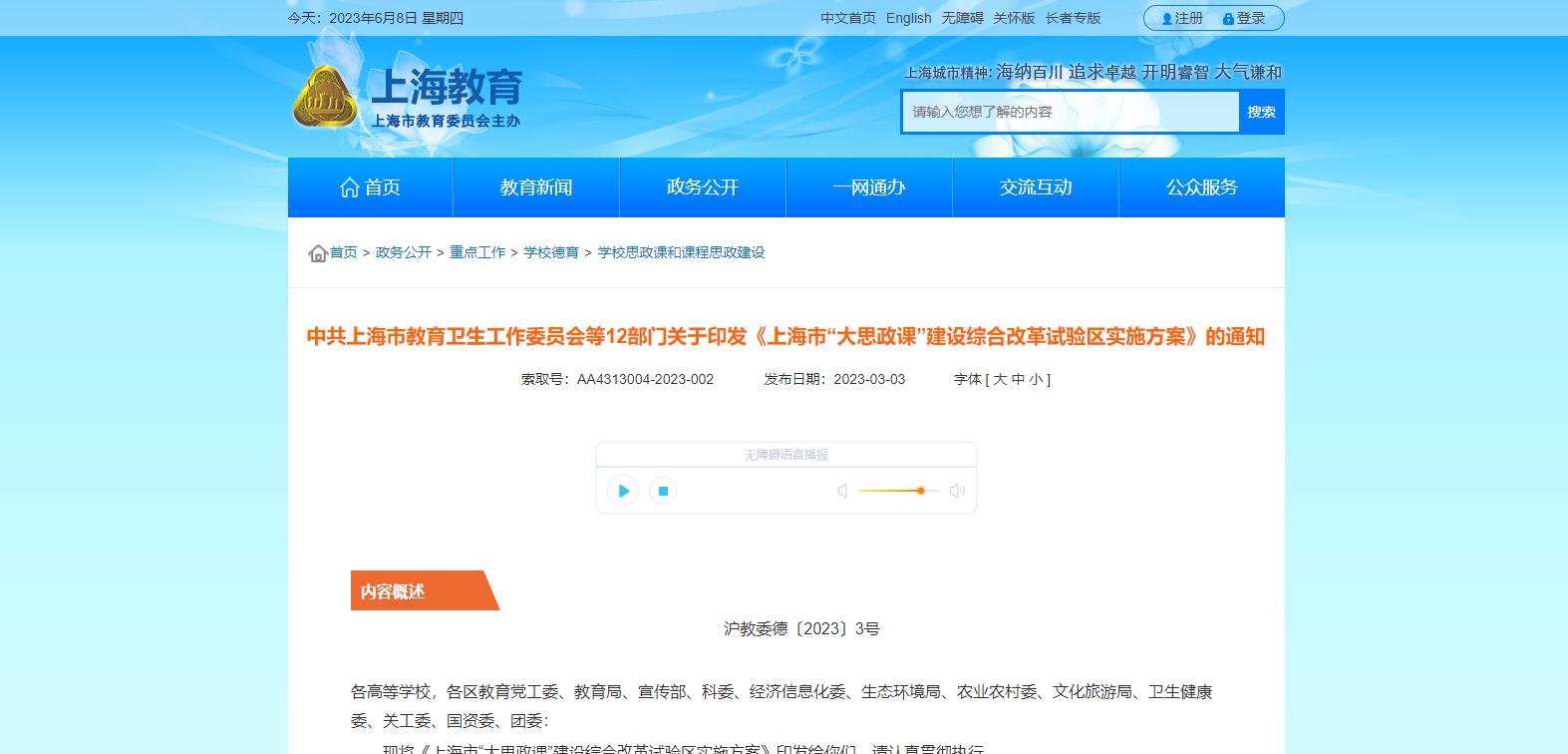 中共上海市教育衛(wèi)生工作委員會等12部門關(guān)于印發(fā)《上海市“大思政課”建設(shè)綜合改革試驗(yàn)區(qū)實(shí)施方案》的通知
