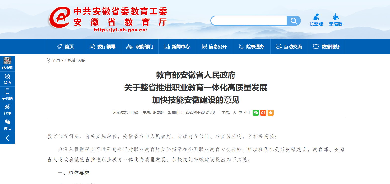 教育部安徽省人民政府關(guān)于整省推進(jìn)職業(yè)教育一體化高質(zhì)量發(fā)展加快技能安徽建設(shè)的意見