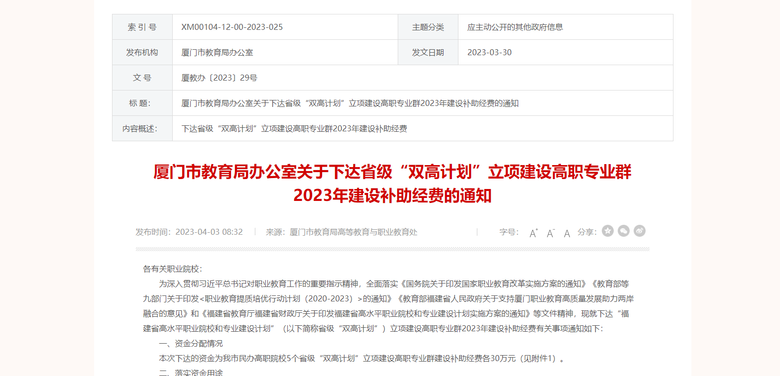 近日,廈門市教育局發(fā)布《關(guān)于下達(dá)省級“雙高計(jì)劃”立項(xiàng)建設(shè)高職專業(yè)群2023年建設(shè)補(bǔ)助經(jīng)費(fèi)的通知》,為我市民辦高職院校5個省級“雙高計(jì)劃”立項(xiàng)建設(shè)高職專業(yè)群建設(shè)補(bǔ)助經(jīng)費(fèi)各30萬元。 ......