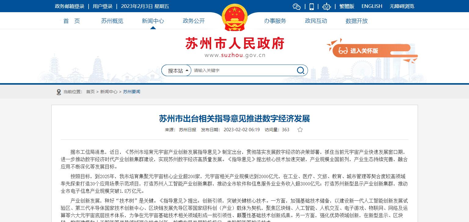 蘇州發(fā)布培育元宇宙產業(yè)創(chuàng)新發(fā)展指導意見:到2025年元宇宙相關產業(yè)規(guī)模達到2000億元