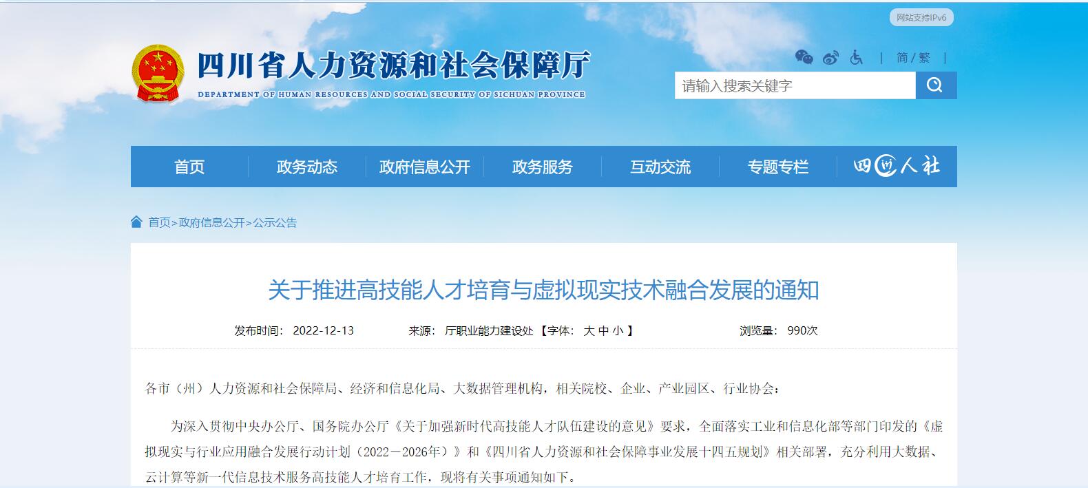 四川省人社廳等3部門聯(lián)合印發(fā)《關(guān)于推進(jìn)高技能人才培育與虛擬現(xiàn)實(shí)技術(shù)融合發(fā)展的通知》