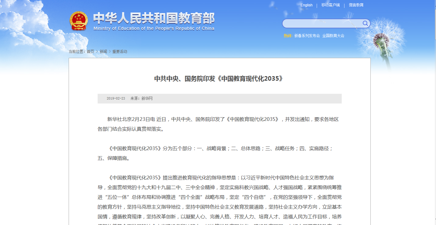 近日,中共中央、國務院印發(fā)了《中國教育現(xiàn)代化2035》,其中提到2035年主要發(fā)展目標是:建成服務全民終身學習的現(xiàn)代教育體系、普及有質(zhì)量的學前教育、實現(xiàn)優(yōu)質(zhì)均衡的義務教育、全面普及高中階段教育、職業(yè)教......